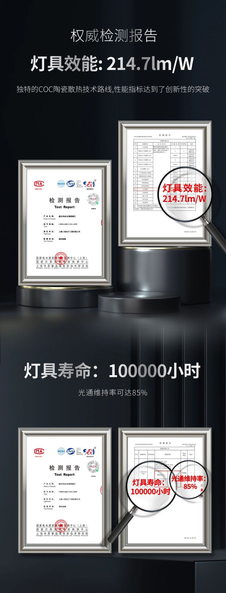 使產品的係統光效顯著提升至214.7 lm/W,10萬小時光通維持率不低於85%!大香蕉9草在线(sī)超長壽命COC陶瓷路燈(dēng)的(de)綜合性(xìng)能指標優勢顯著,為全球節能減排提供新的“利器”。