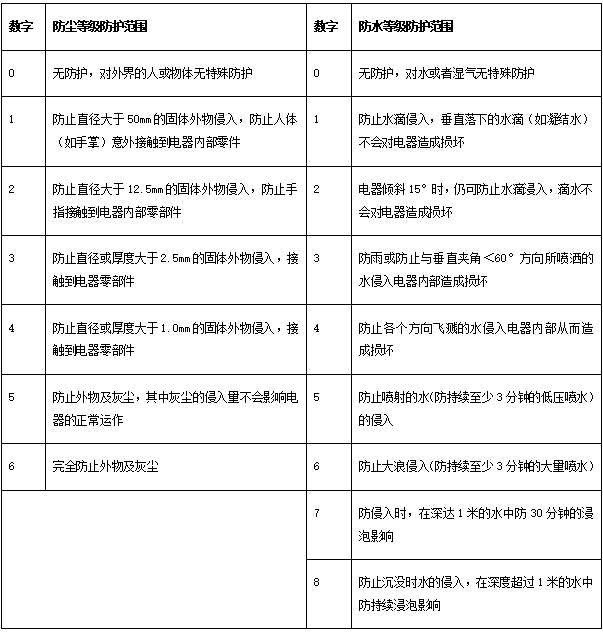 下麵表格,簡要標明了(le)IP防護等級標準。