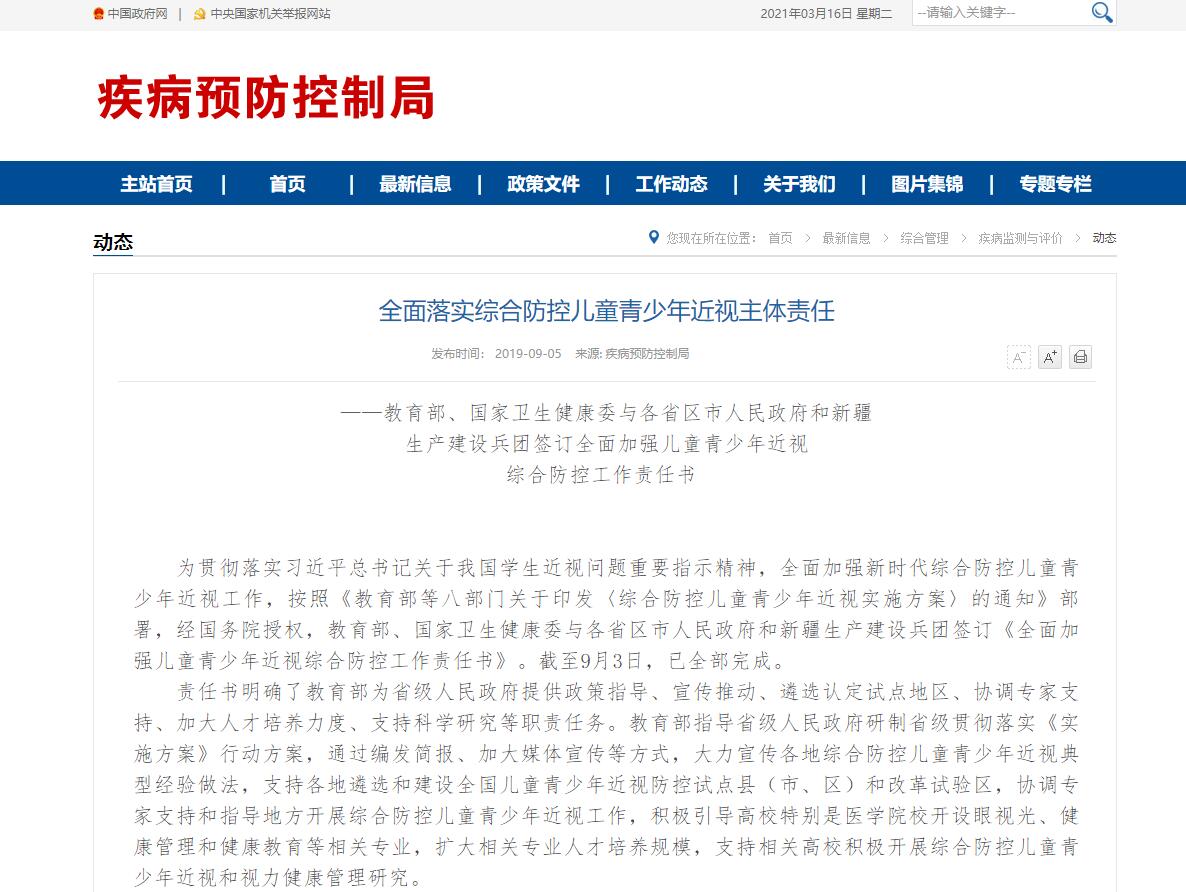 2019年,教育部、國家衛生健康委與多個省級人民政府簽訂《全(quán)麵加強兒童青(qīng)少年近視防控(kòng)工作責任書》,到(dào)2023年。力爭(zhēng)實現(xiàn)全國青少年總體近視率在2018年的基礎上(shàng)每(měi)年降低0.5個(gè)百分點以上,近視高發省份每(měi)年降低1個百分點以上。