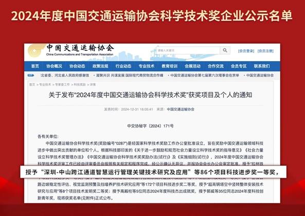 經國家(jiā)科學技術獎勵工作辦公室批準設立的中國交通運輸協會科(kē)學技術獎已發布2024年度獲獎名單。本次發布(bù)共授予9項科技進步特等獎、86項(xiàng)科技進(jìn)步(bù)一等獎、172項科技進步二等獎(jiǎng)及多項技術發明獎(jiǎng),彰顯我國交通運輸領域(yù)科技創(chuàng)新蓬勃生(shēng)態。
