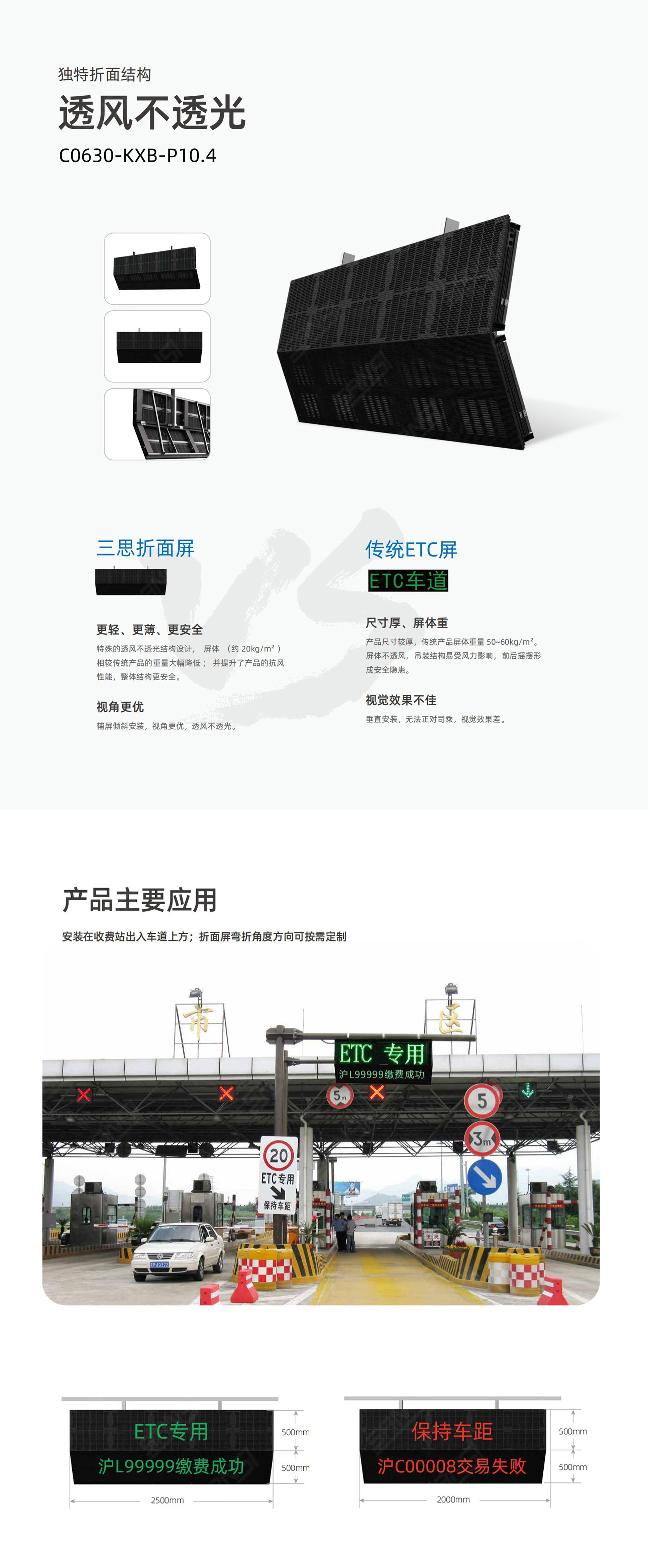 新(xīn)型ETC顯示屏采用特殊的透風不透光結構設計,並提升了產品的抗風性能(néng),整體結構更安全(quán)。屏體由上(shàng)豎屏與折麵屏組成,上豎屏垂直(zhí)安(ān)裝,折麵屏傾斜(xié)安裝。透風折麵ETC顯示屏(píng)一般吊裝於ETC專用車(chē)道上方,用於顯示費用或車牌(pái)等可變信息,通過折麵部分屏體,更便(biàn)於向正在通過ETC車道的駕駛員(yuán)傳(chuán)遞信息,確定(dìng)車輛繳(jiǎo)費成功可通行(háng)。