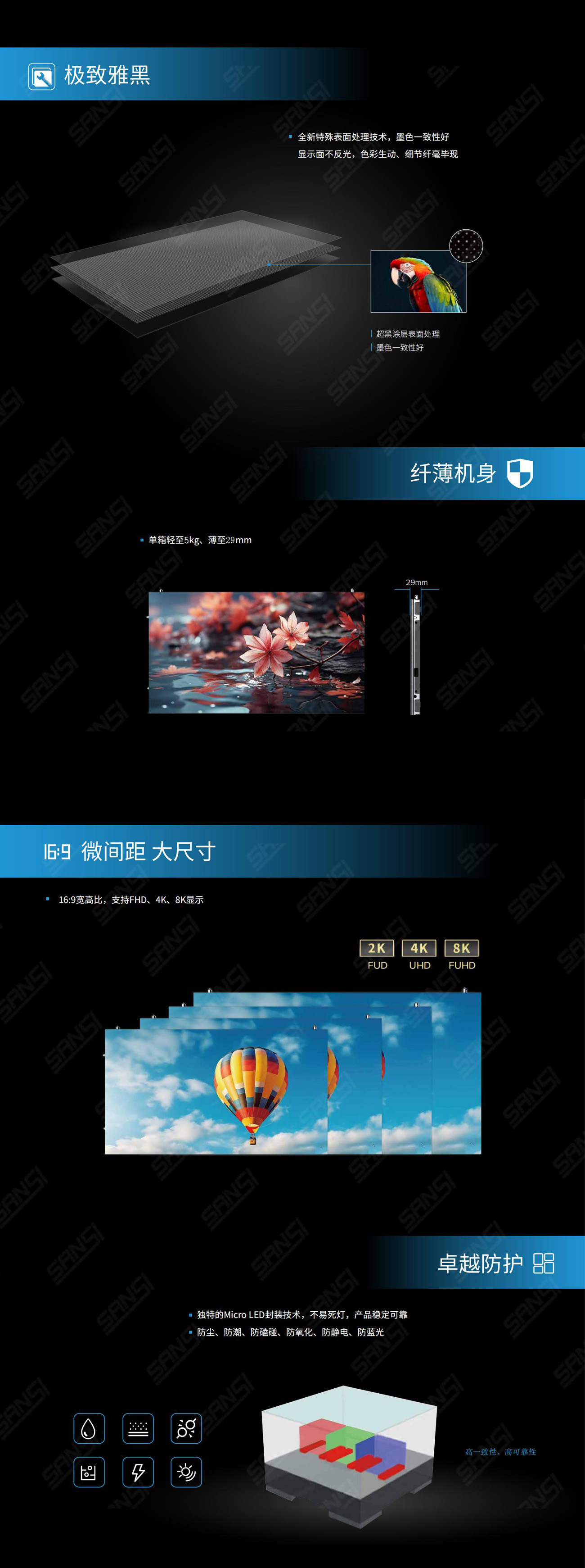 VEⅢ MCOB是一款優秀的COB微間距顯示產品。16:9寬(kuān)高比,600mm的機(jī)身寬度,具有卓越的顯示(shì)性能(néng)。超高解析度,響應速度(dù)快,色域覆蓋廣。具有防水、防潮、防塵、防氧化、防撞、方便清潔等特點(diǎn),十分適合博物館、展覽展示、高端(duān)展廳等需要逼真圖(tú)像(xiàng)的專業領域。